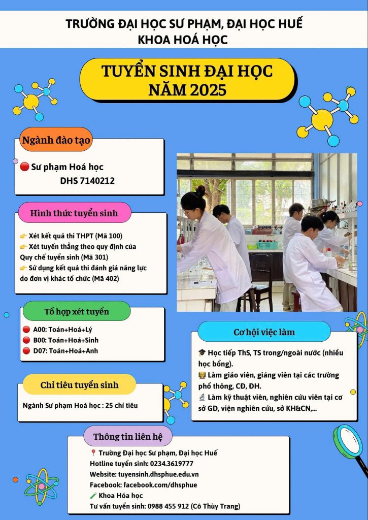 Khoa Hoá học, trường Đại học Sư phạm, Đại học Huế trân trọng thông báo kế hoạch tuyển sinh Đại học hệ chính quy các ngành Sư phạm Hoá học và Sư phạm Hóa học bằng tiếng anh năm 2024 tại Trường Đại học Sư phạm, Đại học Huế.